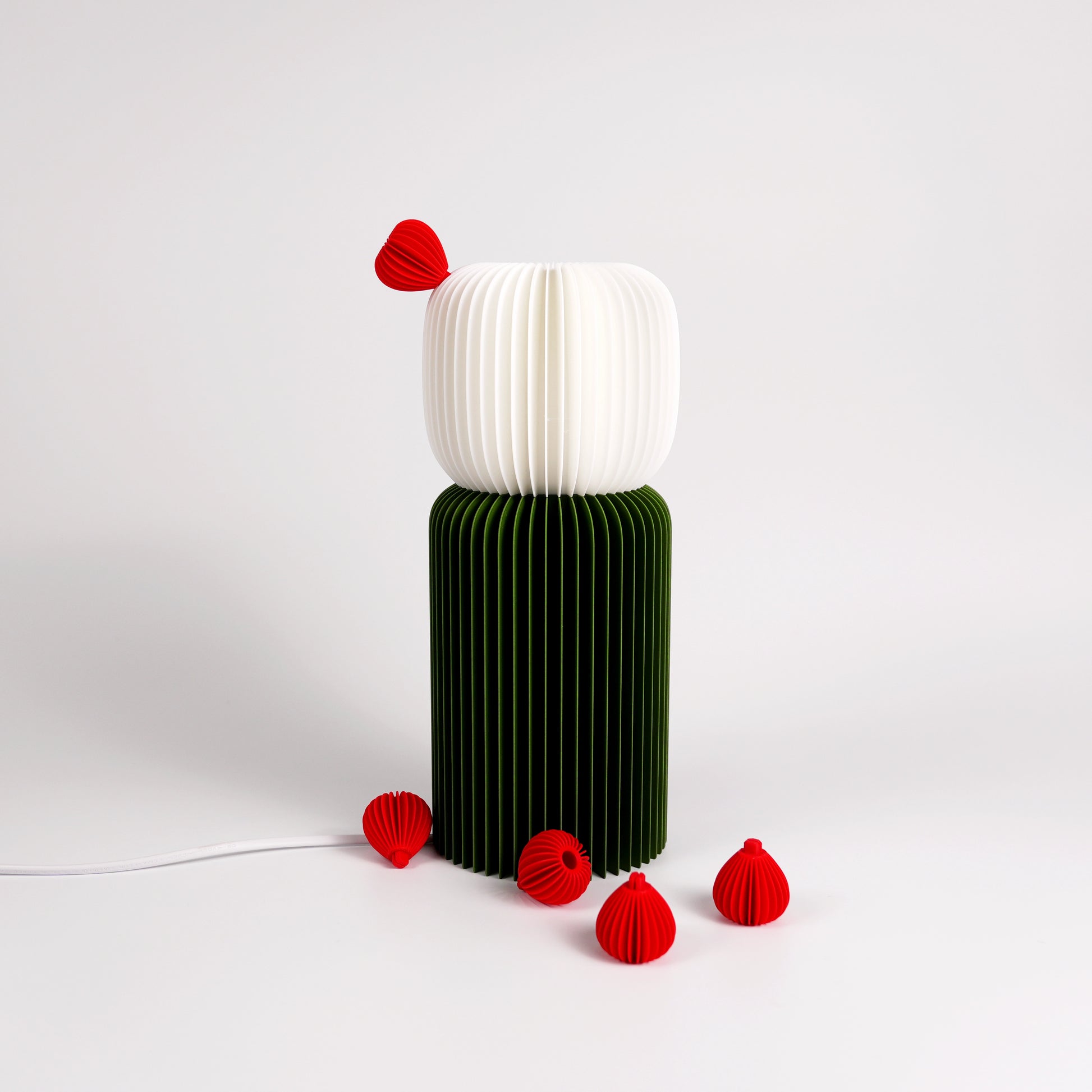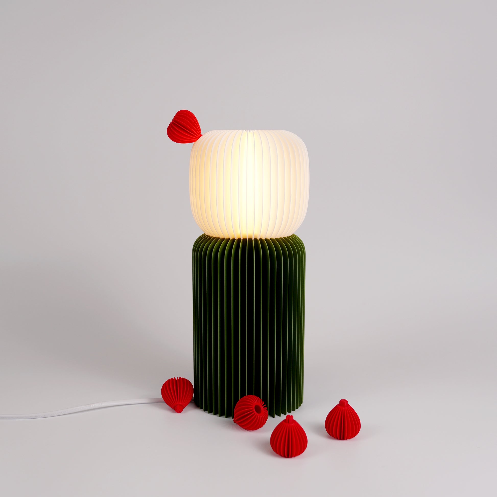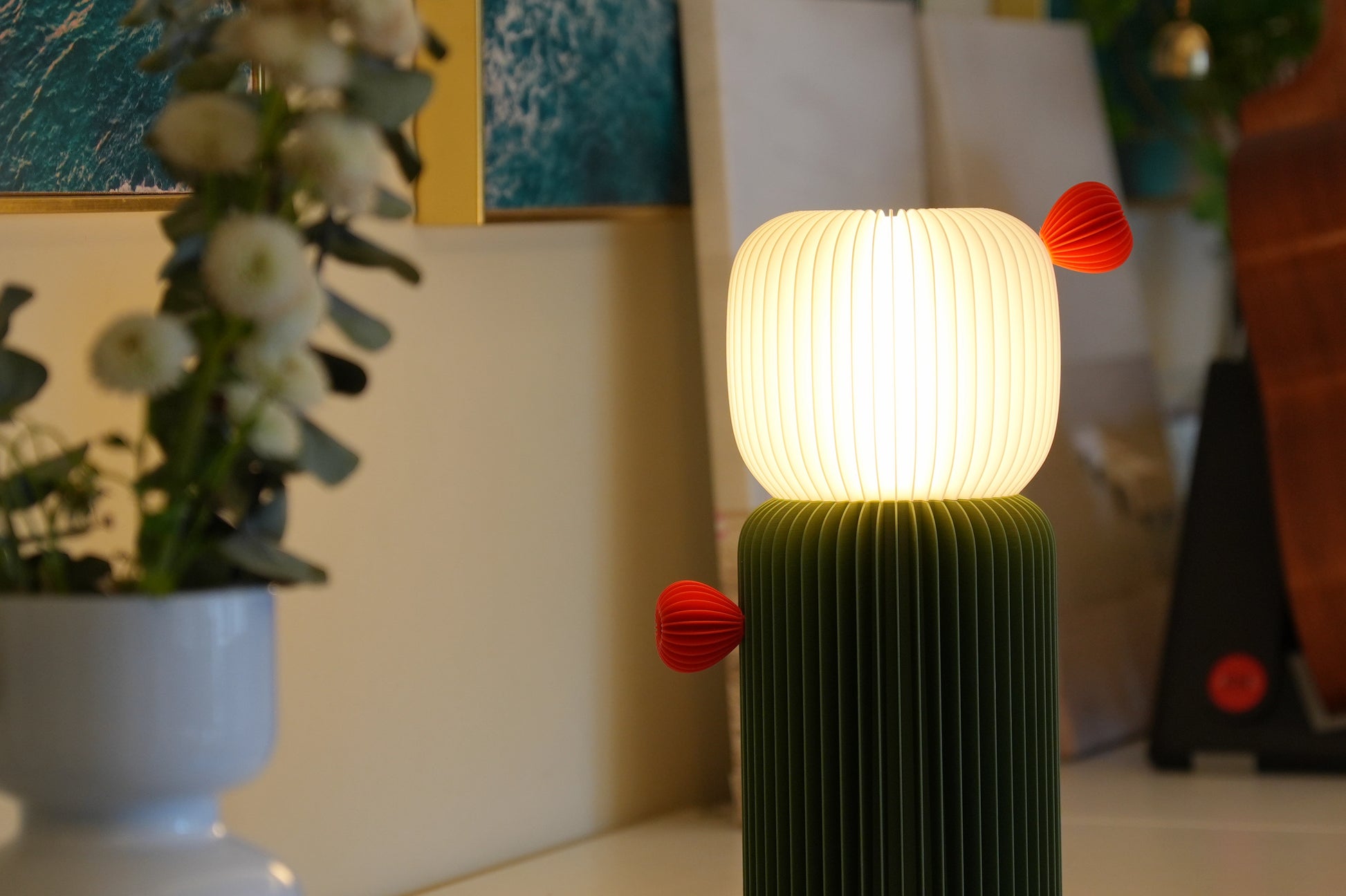 This design draws inspiration from the cactus. While many table lamps depict cacti, I wanted to interpret it from another perspective. I incorporated a white lampshade to mimic the blooming flowers of a cactus and designed several cactus fruits, each with a clip mechanism that allows them to be easily attached to the lamp. This not only breathes new life into the lamp, making it visually more charming, but also introduces a new interactive experience.